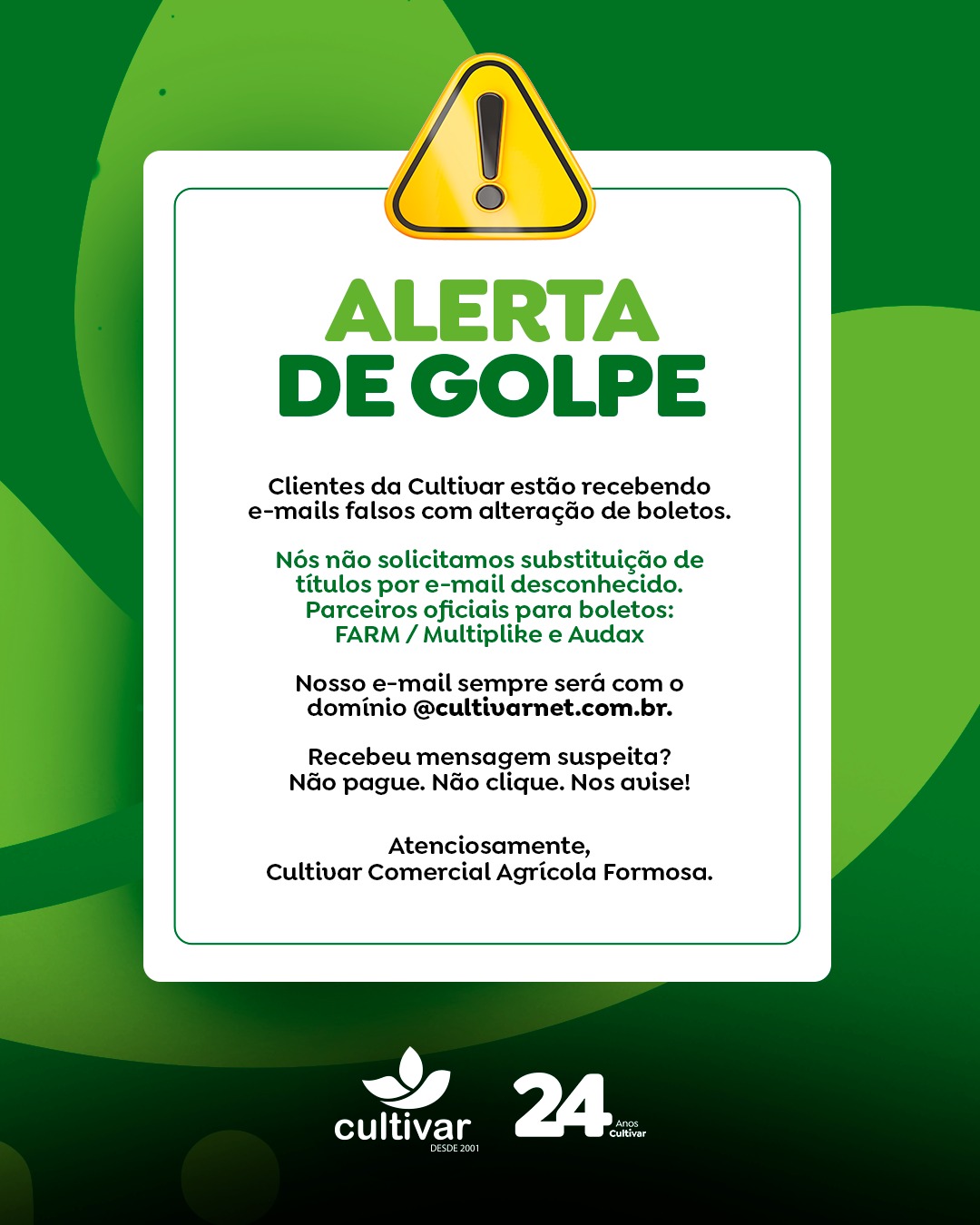 Com uma equipe administrativa e comercial experiente, dedicada, proativa e competente a Cultivar se destaca também por seu amplo portfólio, com diversos fornecedores nos segmentos de agricultura e pecuária, indo desde os fertilizantes e corretivos, aos defensivos agrícolas e pecuários – inseticidas, fungicidas, herbicidas pré e pós emergentes, herbicidas para pastagem, sementes de soja, milho, sorgo, pastagens e plantas de cobertura, adubos foliares e produtos biológicos.